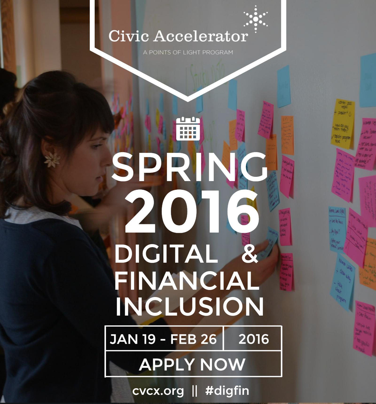 CivicX7-App-FlierWe are thrilled to see the Points of Light Civic Accelerator is launching it’s spring 2016 program with a challenge to accelerate tech adoption and financial inclusion for all. From user-generated and peer-to-peer technologies, equitable access to financial services and skill development, to models that influence savings and spending habits, the potential solutions are many. Learn more at bit.ly/digfininclusion‪#‎CIVICX‬ ‪#‎digfin‬
